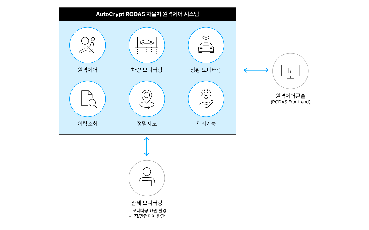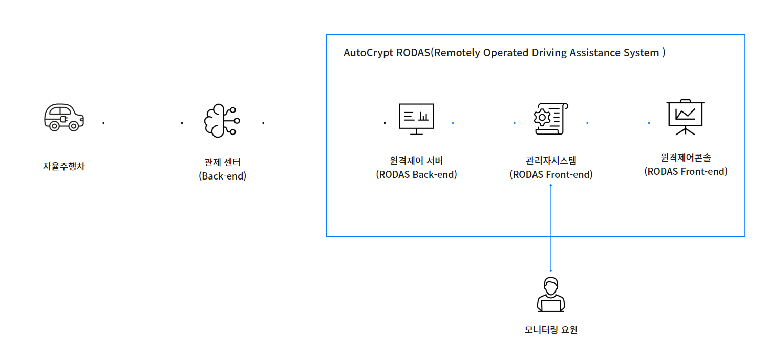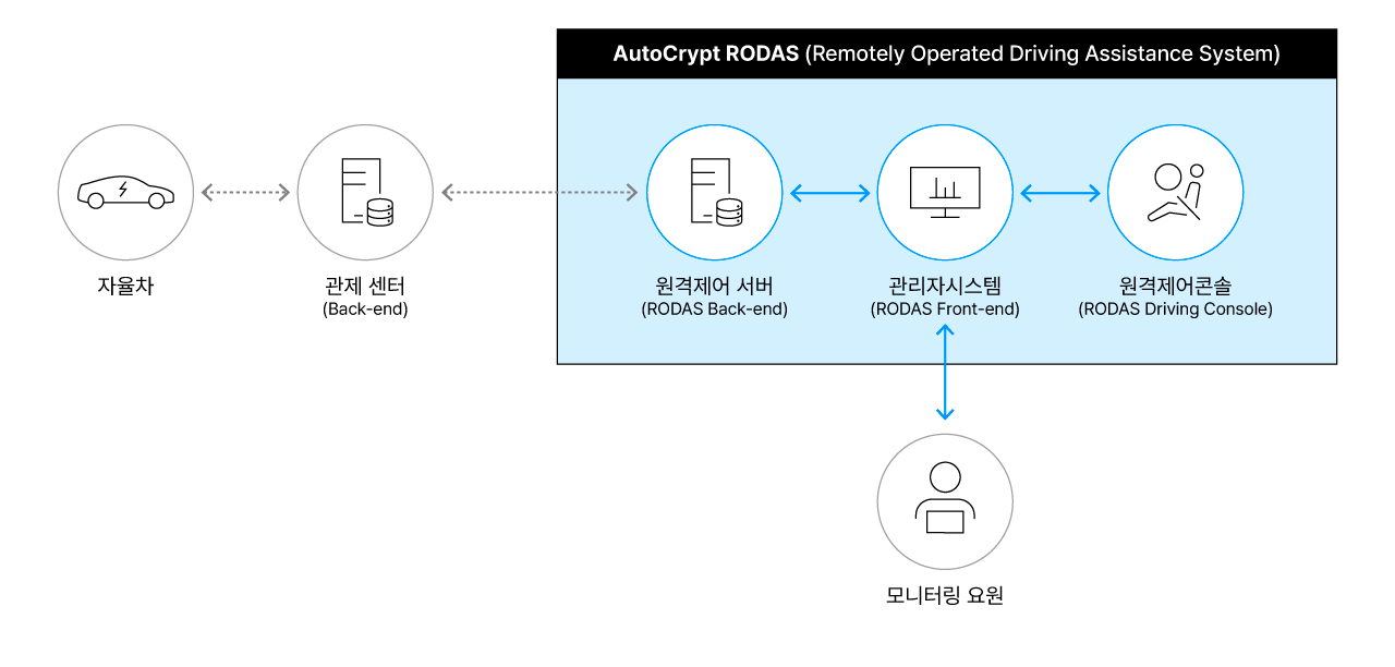 AutoCrypt RODAS(Remotely Operated Driving Assistance System)는, 자율차의 주행 경로 변경 또는, 돌발 상황 등에서, 원격으로 차량을 제어하여, 탑승자의 안전을 보장하고, 편이를 제공합니다.