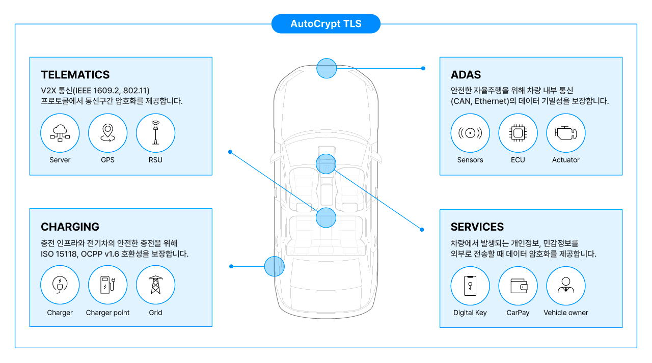 AutoCrypt TLS는 차량 내∙외부 통신 전반에 걸쳐 안전한 데이터 암호화를 제공합니다.