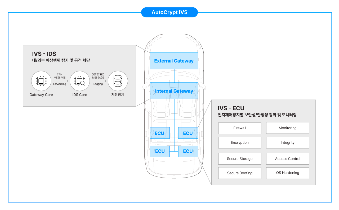 아우토크립트 차량 내부 보안은 차량 내부, 외부의 악의적 위협을 차단하고 차량 내 비정상적인 통신을 모니터링 및 분석하여 IDPS 침입 탐지 및 보호 시스템을 통해 보호